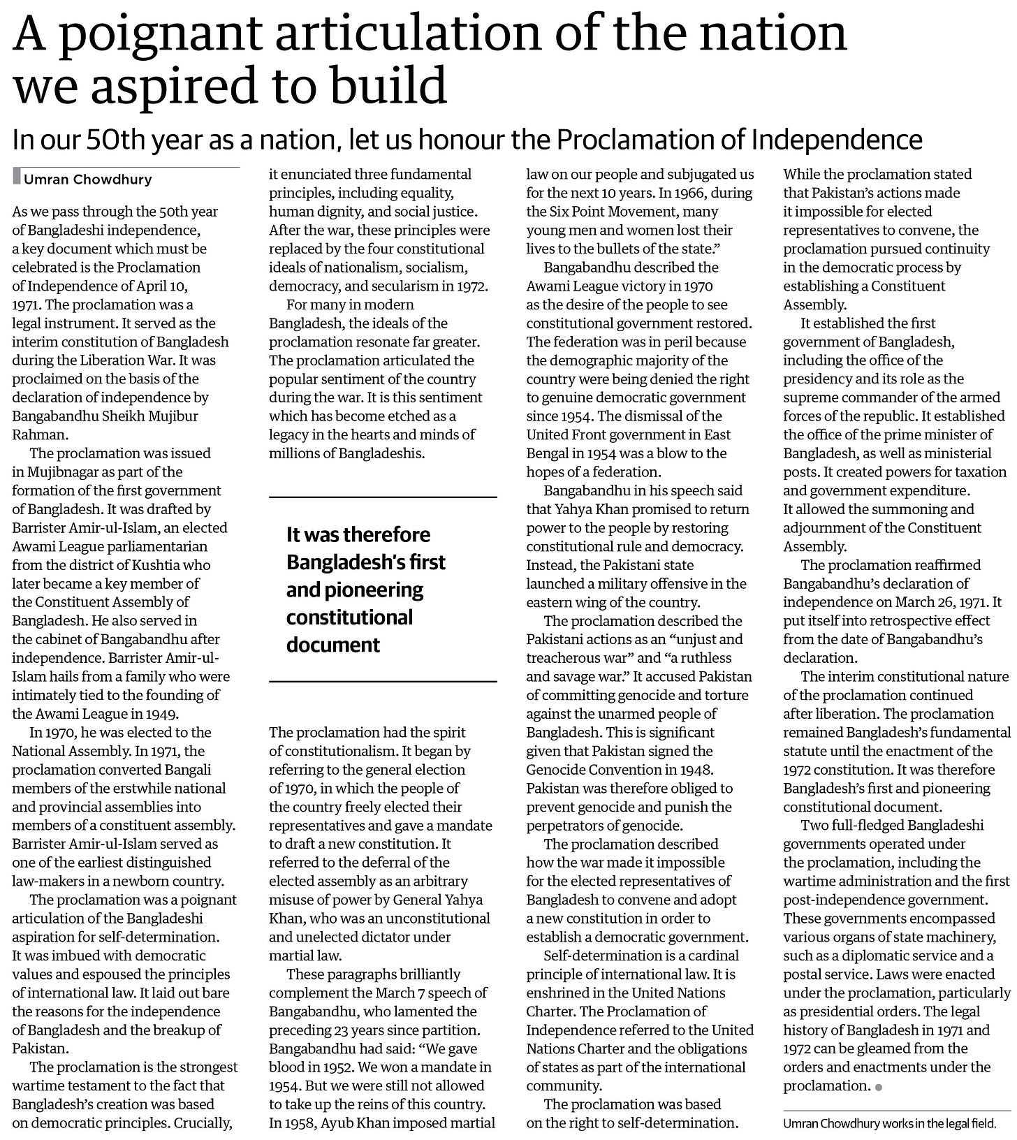 I wrote an article in 2021 which was published in the Dhaka Tribune. It emphasized the historical significance of the proclamation. What always stood out to me were the key principles enunciated by the proclamation: equality, human dignity and social justice. Bangladesh later adopted four fundamental principles in its 1972 constitution, including nationalism, democracy, socialism and secularism. Given that the Proclamation of Independence can be treated as the “genesis of the Bangladesh Constitution”, its key principles can help us explain the spirit of the four fundamental principles to achieve a moderate interpretation of these principles.